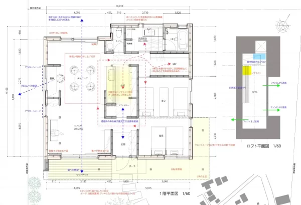 床面積を必要十分な程度まで(6.5坪/人)小さくして暮らすこと、廊下や活用頻度の少ない部屋を設けない等の間取りの工夫により、全館空調を採用しても増エネにならないように計画している。
