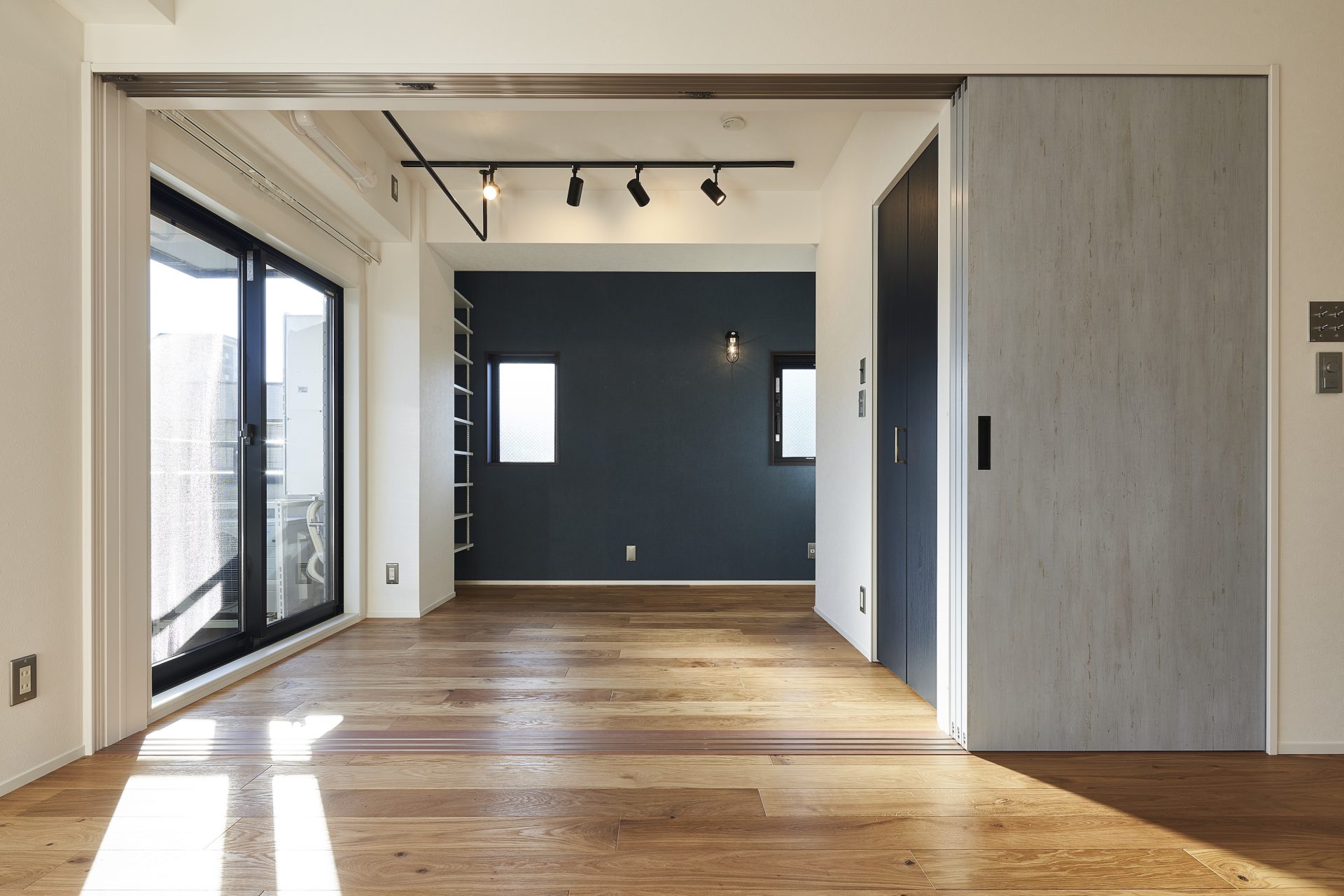 ご自宅兼賃貸マンションの2室を1室へ改修。 意匠・快適性・資産価値をデザインし、親・子・孫が喜ぶエコで快適なすまい、将来的な賃貸収益も見据えた長期的改修を実施しました。 子どもの成長を見守れるリビングスペース、将来的な個室利用にも配慮したフレキシブルなプランに変更しました。 2つある出入り口も有効活用し、キッチンへ直接入れるバックドア・パントリーを設けています。